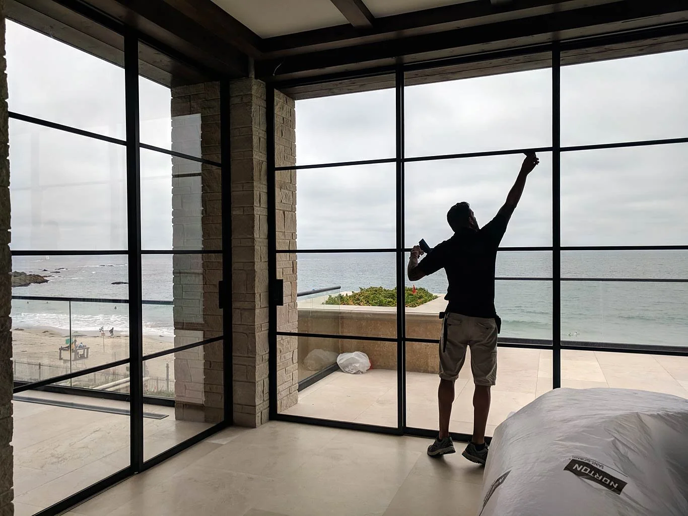 A person standing inside a modern building with floor-to-ceiling windows, looking out at a beach and ocean, taking a selfie with a phone in one hand and raising the other arm.