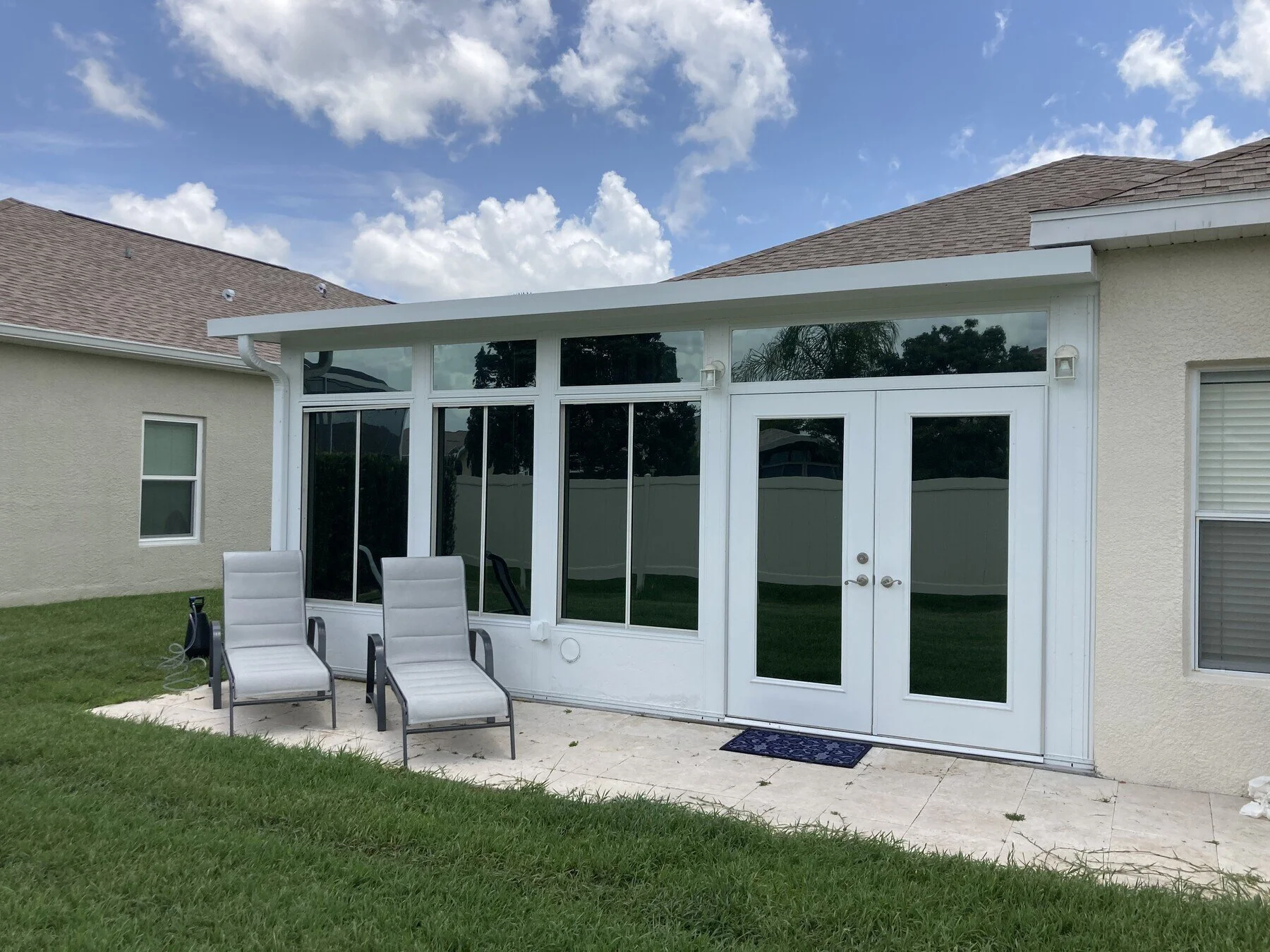 Backyard patio with large glass windows and doors, tinted with dual reflective residential window tint.